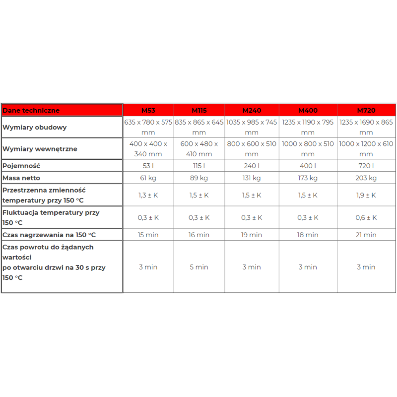 | Model | Pojemność | Masa | Wymiary |