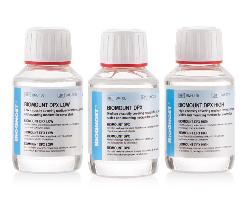 • BIOMOUNT DPX LOW BML - Medium o niskiej lepkości do trwałego zakrycia próbki. Stosowane w automatach zaklejających. Baza: xylene (BioClear); Lepkość 140-160 [cSt,mPa @20C];  wsp. załamania: 1.5115-1.5135