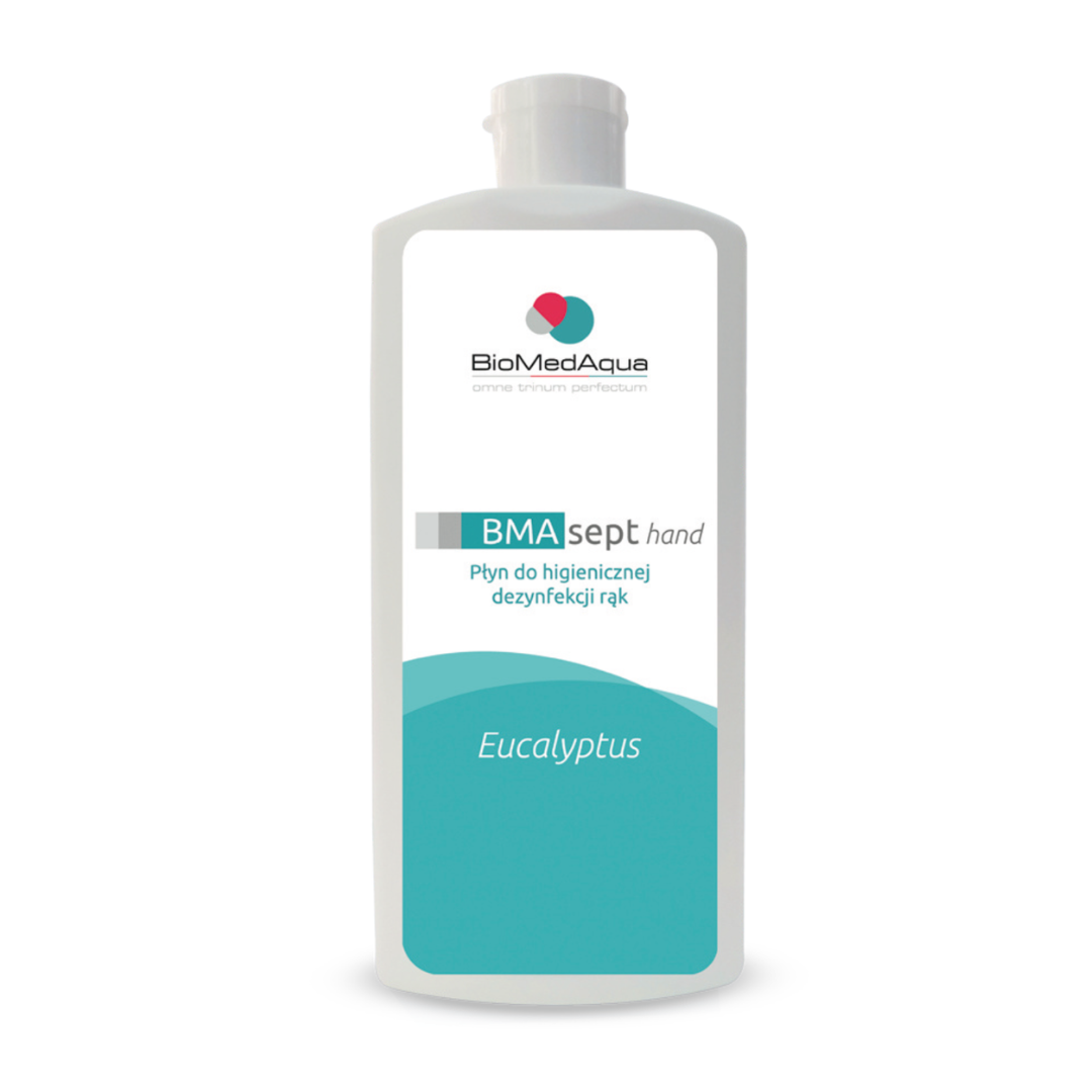 BMAsept hand – płyn do higienicznej dezynfekcji rąk zawierający kwas podchlorawy o stężeniu 510ppm. Skuteczność potwierdzona badaniami laboratoryjnymi: PN-EN 1500, PN-EN 14476, PN-EN 13727, PN-EN 14348, PN-EN 13697.