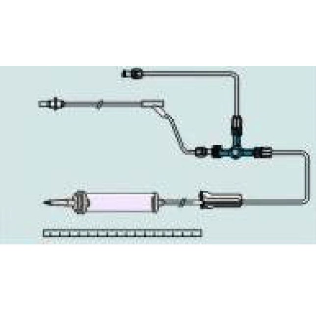 Manualny zestaw z manometrem do pomiaru OCŻ. Zestaw do mierzenia Ośrodkowego Ciśnienia Żylnego zestaw posiada dren pomiarowy, linię płuczącą z biuretą oraz zamknięciem rolkowym, linię z portem igłowym, kranik, skalę pomiarową.