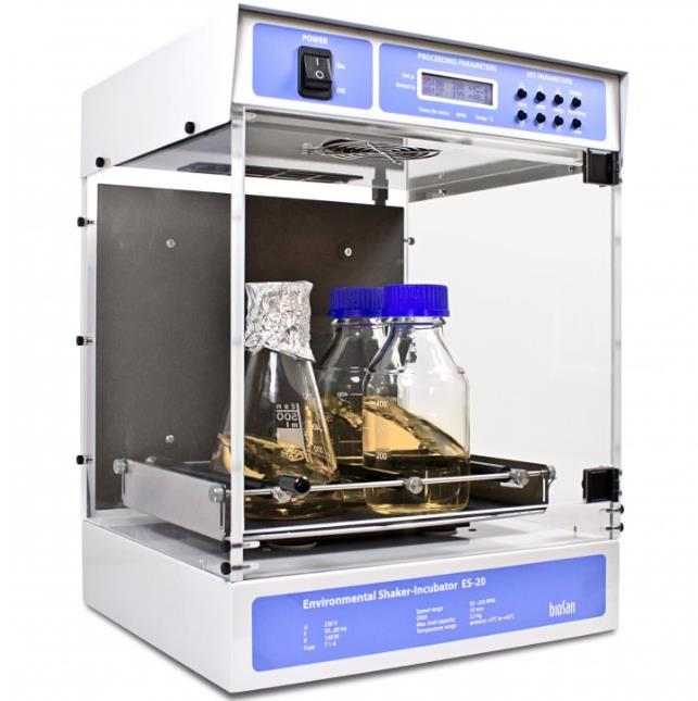 Wytrząsarka orbitalna z inkubacją ES-20 jest kompaktowym nastołowym urządzeniem używanym do mieszania płynów biologicznych, jak również do inkubacji i hodowli płynów biologicznych zgodnie z ustawionym przez użytkownika programem pracy. Wbudowany mikroprocesor zapewnia stałą kontrolę temperatury w komorze inkubatora. Wymuszenie cyrkulacji ogrzanego powietrza w komorze z przezroczystego pleksiglassu gwarantuje równomierny rozkład temperatury. Demontowalna konstrukcja ułatwia transportowanie urządzenia. Wytrząsanie orbitalne jest kontrolowane przez cyfrowy obrotomierz oraz cyfrowo ustawiony czas pracy niezależnie od temperatury. Urządzenie wyposażone jest w system bezpośredniego napędu zapewniając stabilną pracę w czasie prowadzenia długotrwałych hodowli (do 30 dni/nocy).