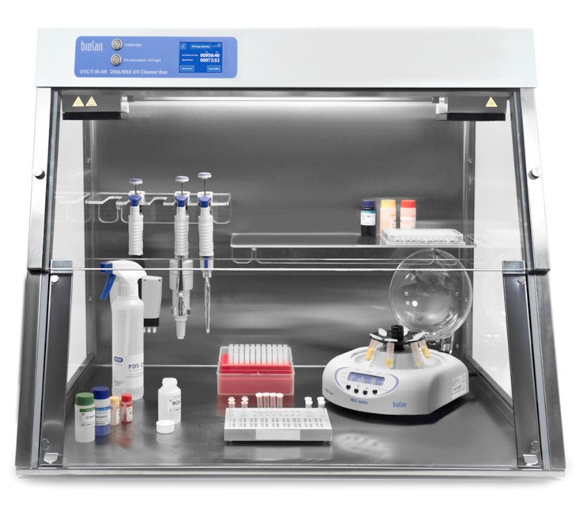 Komora jest wyposażona w otwartą lampę UV zainstalowaną w górnej części komory. Promieniowanie UV z otwartej lampy dezynfekuje powierzchnię roboczą dezaktywując fragmenty DNA/RNA w ciągu 15-30 min ekspozycji. Cyfrowy timer kontroluje czas naświetlania. Lampa światła białego zapewnia właściwe oświetlenie powierzchni roboczej.