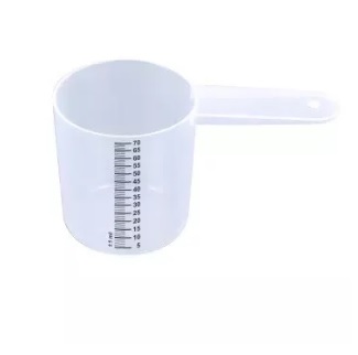 Naczynie miarowe o pojemności 75 ml ze skalą do odmierzania produktów płynnych i sypkich.