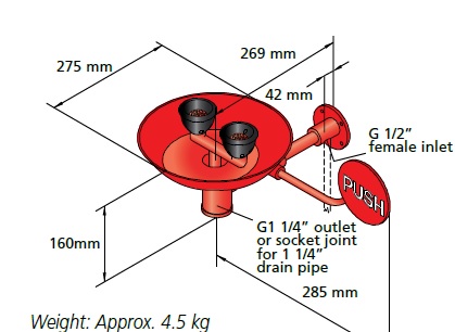Natrysk do oczu i twarzy z dwoma głowicami z mosiądzu pokryty powłoką BROEN POLYCOAT z misa ze stali nierdzewnej. Montowany do naściennych przewodów rurowych. Ilość wody regulowana przy pomocy urządzenia FLOWFIX (26 l/min). Min. ciśnienie robocze: 1.5 bar.
