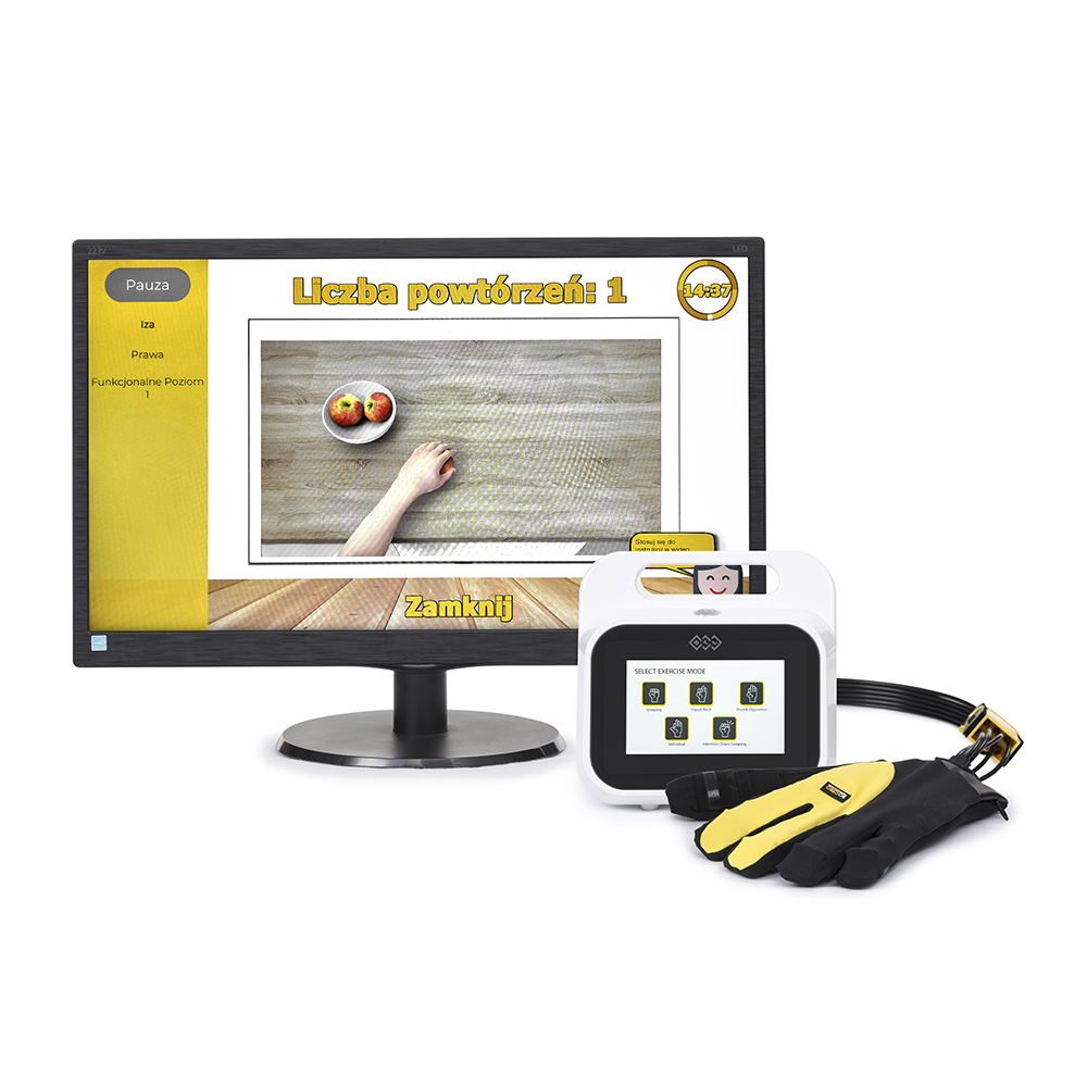 • Akcesoria standardowe: jednostka sterująca, zestaw przewodów, rękawica w rozmiarze S,M,L, dla lewej oraz dla prawej ręki, opaska na kciuk, pasek na nadgarstek