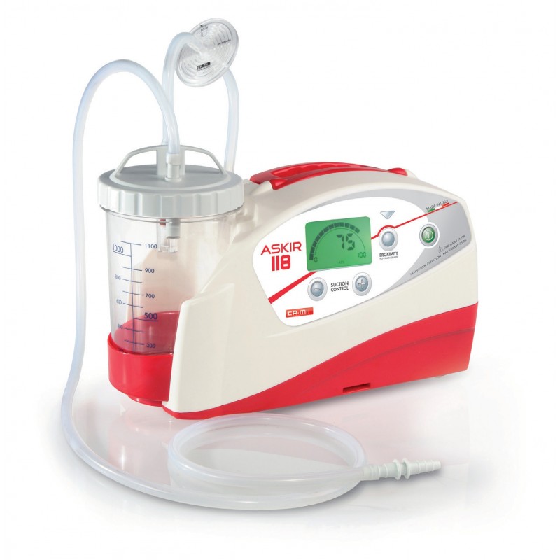ASKIR 118WM, ssak przeznaczony do ambulansów pogotowia i transportu chorych. Wyposażony w podświetlany wyświetlacz do odczytu parametrów oraz przyciski sensorowe do precyzyjnego ustawienia wartości podciśnienia. Ssak działa w sposób inteligentny, czyli samodzielnie kontroluje siłę odsysania i automatycznie maksymalizuje ją w chwili przyłożenia końcówki do miejsca odsysania. Dzięki temu lepiej wykorzystuje akumulator oraz zmniejsza poziom hałasu. Wyposażony w: torbę, uchwyt zasilający do mocowania w karetce, przetestowany dynamicznie zgodnie z normą EN 1789:2007, wytrzymujący przeciążenie do 10G. Ssak posiada dodatkową funkcję bezdotykowego włączenia i wyłączenia urządzenia, wystarczy zbliżyć dłoń do czujnika, nie trzeba dotykać włącznika.