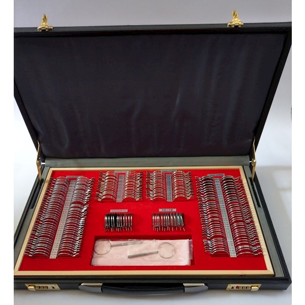 Szkła w oprawach metalowych,srebrnych, wąskich przystosowanych do perymetrii. Średnica szkła - 38 mm