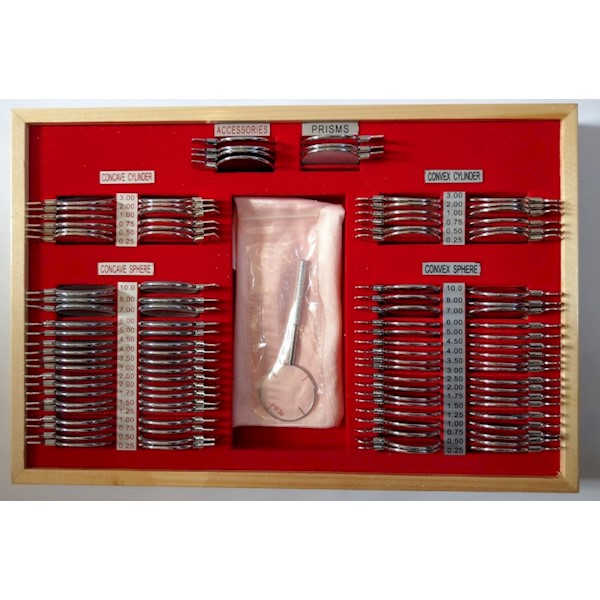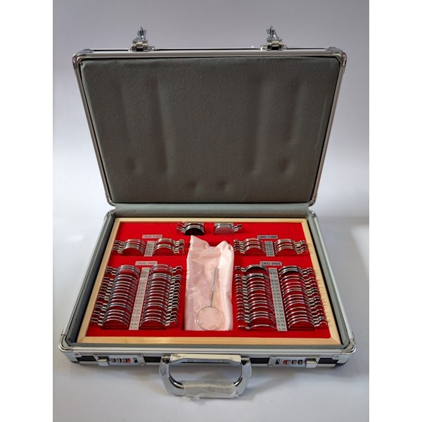 Szkła w oprawach metalowych-srebrnych, wąskich przystosowanych do perymetrii. Średnica szkła - 38 mm.