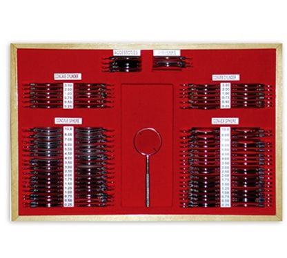 Szkła w oprawach metalowych (czerwono-czarnych), wąskich przystosowanych do perymetrii; całość w eleganckiej walizce z możliwością wyjmowania z niej drewnianej, wyściełanej kasety.