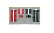 Zestaw szkieł probierczych w eleganckiej walizce z możliwością wyjmowania drewnianej wyściełanej kasetki. Szkła w oprawach metalowych, wąskich przystosowanych do perymetrii. oprawy szkieł w kolorze czerwonym/czarnym.