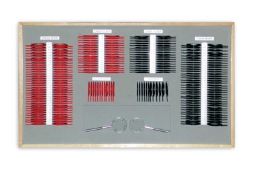 Zestaw szkieł probierczych w eleganckiej walizce z możliwością wyjmowania drewnianej wyściełanej kasetki. Szkła w oprawach metalowych, wąskich przystosowanych do perymetrii.