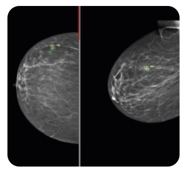 Oprogramowanie stworzone do szczegółowej analizy zdjęć mammograficznych. Obiektywnie ocenia gęstość tkanki piersiowej zgodnie z BI-RADS. Użytkownik otrzymuje alert o występowaniu mikrozwapnień, asymetrii gęstości i zmian patologicznych oraz punktową ocenę ryzyka ich złośliwości. Predykcje AI są wyraźnie prezentowane bezpośrednio na zdjęciu w systemie PACS.