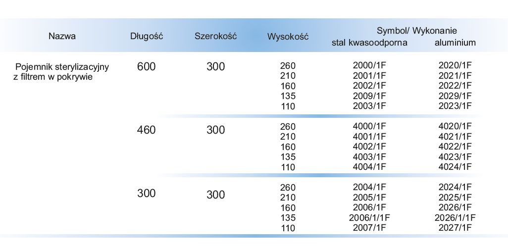- Pojemniki sterylizacyjne z filtrem w pokrywie mogą być wykonane ze stali kwasoodpornej (AISI 304/ PN 0H18N9) lub aluminium (5005).