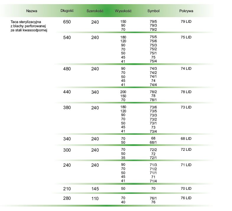 rozwoju środków transportu w nowoczesnych centralnych sterylizatorniach. Tace sterylizacyjne firmy CBM spełniają wymagania Dyrektywy o wyrobach medycznych. Tace są wykonane z blachy perforowanej ze stali kwasoodpornej (AISI 304 / PN 0H18N9). Stal kwasoodporna nie ulega deformacji ani nie zmienia swoich właściwości pod wpływem ciepła i pary wodnej. Posiada wysoką odporność mechaniczną, co zapewnia długi okres użytkowania tac. Perforacja blachy jest bardzo gęsta, zapewniając takie same warunki mycia jak na tacy z siatki drucianej.