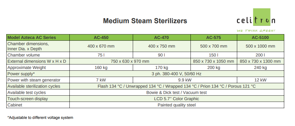 Najwyższej jakości sterylizatory Azteca AC to sterylizatory wyposażone w sterylizację próżniową wstępną oraz końcową. Sterylizatory te są przeznaczone do sterylizacji opakowanego lub nieopakowanego asortymentu, takiego jak narzędzia chirurgiczne, tkaniny, naczynia, wyroby gumowe oraz wykonane z innego stabilnego termicznie i odpornego na wilgoć materiału. Dzięki swojej dużej pojemności od 75 do 200 litrów mają szerokie pole zastosowań w szpitalach, ośrodkach medycznych i laboratoriach.