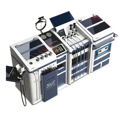 Unit XU7 - modułowa konstrukcja pozwala na dowolne konfigurowanie unitu zgodnie z potrzebami i oczekiwaniami użytkownika. Centralną jednostkę stanowi moduł funkcyjny XU7 Basic, standardowo wyposażony w system sprężonego powietrza, moduł płukania ucha ciepłą wodą, ssak z systemem dezynfekcji drenu, podgrzewacz lusterek, stojak na lampę nagłowną oraz podgrzewaną powierzchnię na instrumentarium. Wszystkimi funkcjami unitu steruje się za pomocą dotykowego, kolorowego wyświetlacza 7’’.