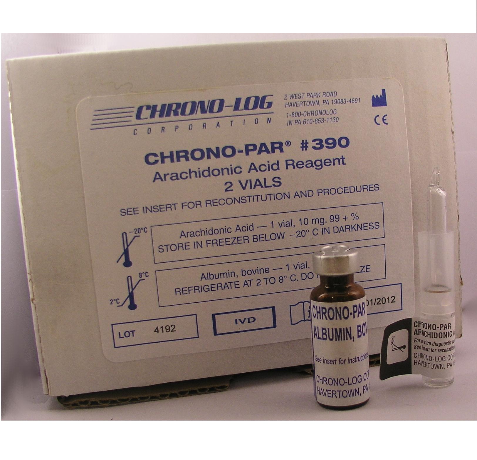Przygotowanie: Do fiolki zawierającej albuminę dodać 1 mL jałowej soli fizjologicznej. Pozostawić na 15-30 minut od czasu do czasu mieszając delikatnie do całkowitego rozpuszczenia albuminy. Kwas arachidonowy jest w postaci oleistej kropli. Krótko zwirować. Odpipetować 700 uL rozpuszczonej albuminy w porcjach po 100 uL, tak aby mieć pewność, że cały kwas arachidonowy został zmieszany. (Nie pipetować jednorazowo 700 uL). Mieszaninę przenieść do probówki typu Eppendorf i worteksować przez 5 minut. Zworteksowany reagent powinien być mleczny z dużą ilością pęcherzy powietrza. Każdorazowo przed użyciem należy mieszaninę worteksować przez 2 minuty.