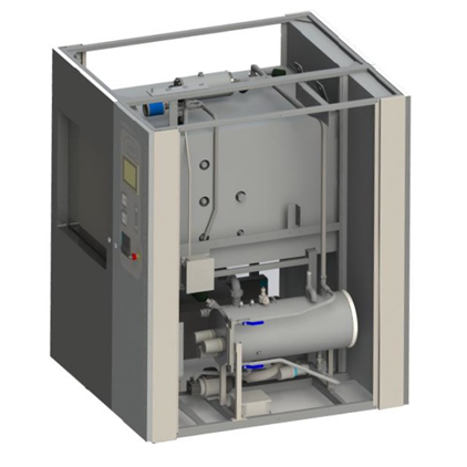 Urządzenie wyposażono w system próżniowy, który składa się z wysokowydajnej, jednostopniowej pompy próżniowej z pierścieniem cieczowym, która zapewnia szybkie usuwanie powietrza podczas etapu wstępnego próżni i lepsze suszenie podczas etapu po próżni. Pompa jest zainstalowana na specjalnych uchwytach antywibracyjnych, które zapobiegają hałasowi i wibracjom na konstrukcji urządzenia. Poprzez użycie impulsów pary / próżni podczas etapu wstępnego próżni, całe powietrze jest usuwane, aby zapewnić doskonałą przenikalność pary wodnej wewnątrz wsadu. Gorące opary z urządzenia są chłodzone poprzez rurowo-gniazdowy wymiennik ciepła przed wejściem do pompy próżniowej. System chłodzenia, zasilany przez wodę z sieci wodociągowej chroni pompę próżniową przed gorącymi oparami z komory.