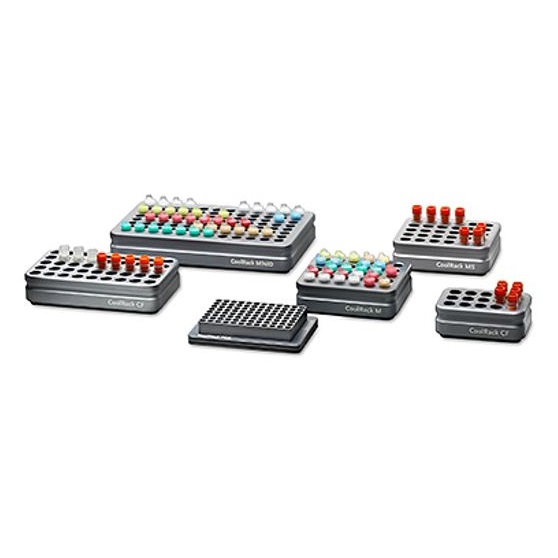 z probówek umieszczonych bezpośrednio w lodzie, suchym lodzie, łaźniach alkoholowych, łaźniach wodnych i innych źródłach temperatury. Moduł termoprzewodzacy umieszczony bezpośrednio na źródle temperatury w zakresie od -196°C do >100°C szybko dostosowuje się do zadanej temperatury. Moduł CoolRack zapewnia równomierność temperatury +/- 0,1°C we wszystkich probówkach podczas chłodzenia, szybkiego zamrażania, podgrzewania lub rozmrażania.