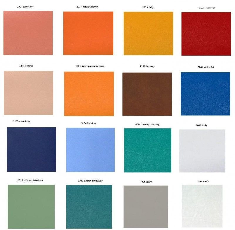 Kozetka wykonana jest z rury stalowej, pokrytej farbą proszkową na kolor biały. Leże tapicerowane jest bezszwowo, gąbką i skajem. Wyposażeniem standardowym jest uchwyt na rolkę podkładu papierowego oraz stopka umożliwiająca poziomowanie leżanki na nierównym podłożu.