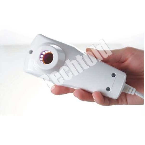 Kamera Visiopor PP 34 N używa specjalnego światła UV aby uwidocznić zmiany trądzikowe o powierzchni 8 x 10 mm. Pomarańczowo- czerwona fluorescencja wskazuje na obecność bakterii Propionibacterium Acnes, która wywołuje trądzik młodzieńczy.