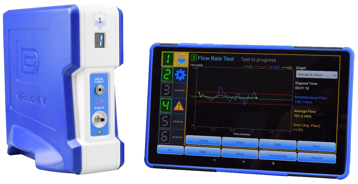 vPad-IV spełnia wszystkie wymagania testowe IEC 60601-2-24 dla pomp infuzyjnych i sterowników pomp. Oprócz oczekiwanych testów przepływu i objętości, vPad-IV jest standardowo wyposażony w test podwójnej szybkości (Keep-Vein-Open/Piggyback), test pompy PCA z wbudowanym wyzwalaczem, test ciśnienia okluzji, a nawet łączenie kanałów dla wielu -kanałowe urządzenia do infuzji.