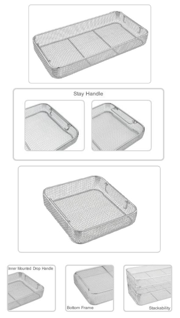 Standardowe kosze są używane do wszystkich typów sterylizatorów. Kosze na artykuły sterylne STE oznaczają kosze wykonane z ciągłego drutu, które zapewniają maksymalną ochronę użytkownika przed urazami. Kosze są składane i można je również zamontować na wózku lub ścianie za pomocą haków.