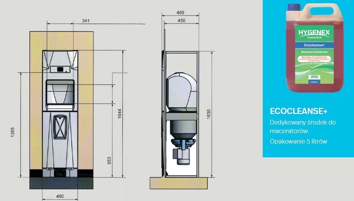 UNO WALL oferuje automatyczny system dezynfekcji i deodoryzacji całej komory maceratora. Komora jest spłukiwana wodą oraz płynem ECOCLEANSE+ pozostawiając komorę czystą i przyjemnie pachnącą.