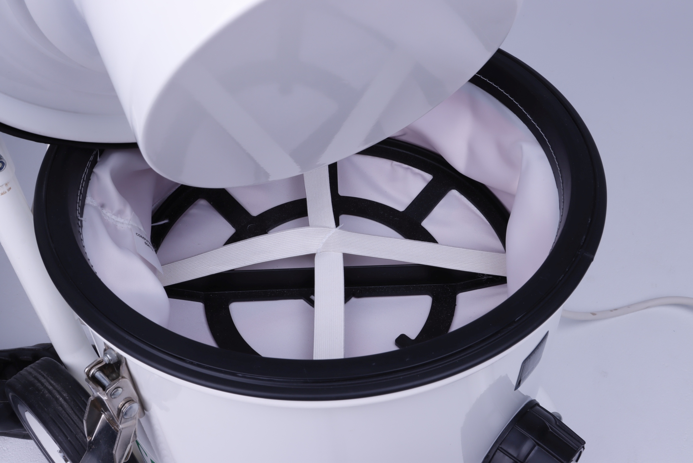 - Czterostopniowy system filtracji składa się z łatwego w wymianie worka (brak w zestawie), dwóch filtrów tkaninowych oraz mikrofiltra Hepa - flo,