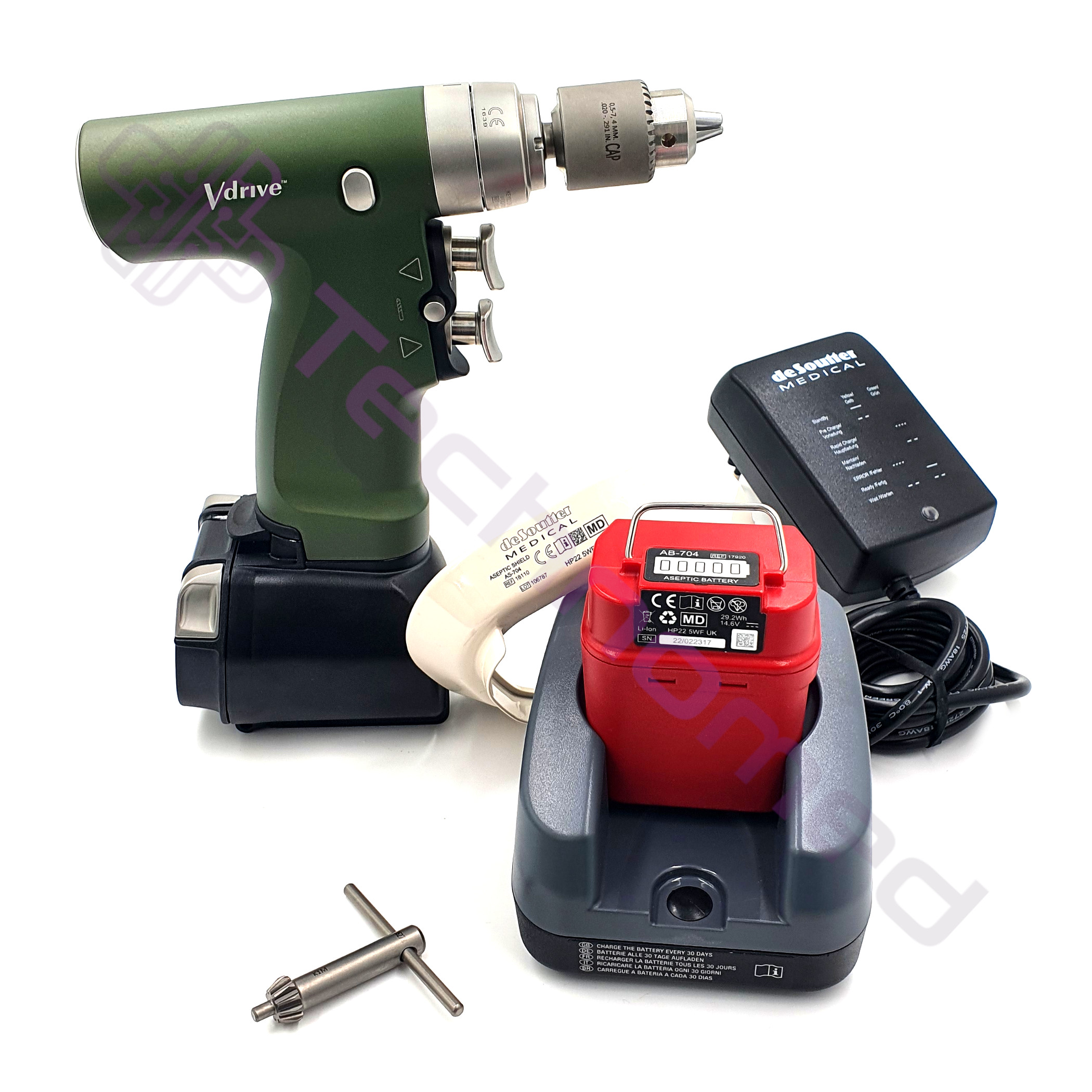 Weterynaryjna wiertarka ortopedyczna DeSoutter z serii V-drive, w skład zestawu wchodzi: