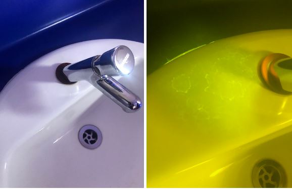 pełna dyskrecja, tylko autoryzowany personel zakładający specjalne okulary Ci-Fi Torch okulary widzi pozostałości śladów biologicznych na czyszczonych powierzchniach.