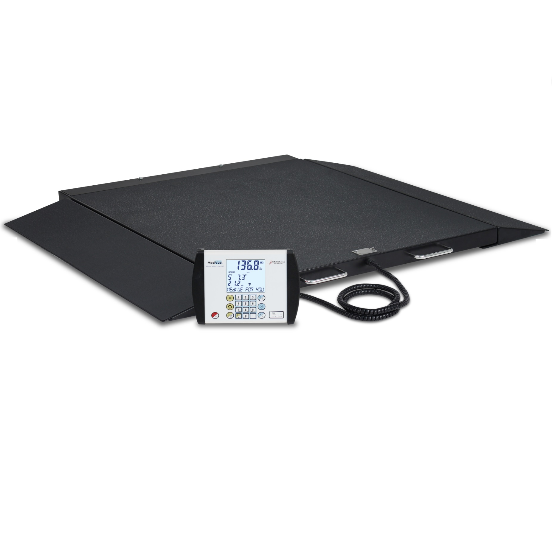 Wszechstronna przenośna, niskoprofilowa waga inwalidzka 6500 firmy DETECTO charakteryzuje się wysoką nośnością 1,000-lb/450-kg, dwukierunkowymi rampami ułatwiającymi dostęp, elastycznym przewodowym zdalnym wyświetlaczem do podglądu na blacie lub na ścianie, cienką platformą 2.2-in/5.6-cm dla łatwej dostępności, dokładnością kliniczną 0.2-lb/0.1-kg, czarną gumową matą dla przyczepności, dwoma uchwytami prowadzącymi i dwoma kołami dla trybu transportu pionowego oraz rozmiarem platformy 32 in x 36 in / 81 cm x 91 cm. Pomimo swoich rozmiarów, te wagi do wózków inwalidzkich są niesamowicie łatwe w obsłudze. Ponieważ wyświetlacz jest połączony z wagą za pomocą długiego, zwiniętego kabla, który rozciąga się do 4,2 m, można go umieścić w miejscu, w którym pracownik służby zdrowia może najłatwiej odczytać wyniki. Waga 6500 jest wyposażona w wielofunkcyjny wskaźnik MedVue z klawiaturą alfanumeryczną oraz portami RS232 i USB (opcjonalnie Wi-Fi i łączność Welch Allyn). Wyświetla jednocześnie wzrost, wagę i wskaźnik masy ciała na ekranie