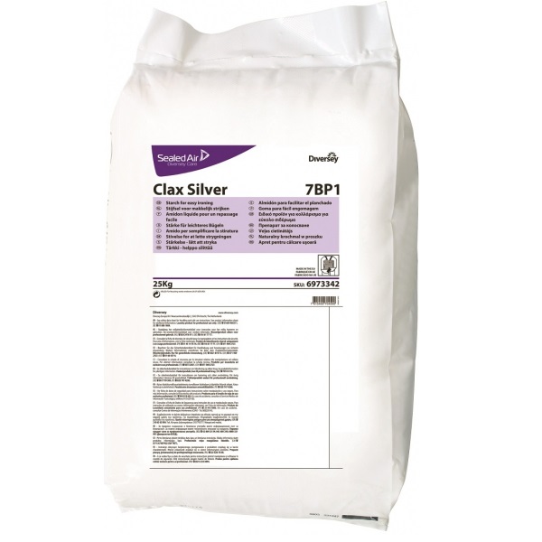 Clax Silver preparatem do krochmalenia tkanin, przeznaczonym do profesjonalnego stosowania w pralniach komercyjnych oraz w pralniach prowadzonych na własne potrzeby. Clax Silver jest preparatem, którego formuła jest oparta na skrobi pszenicznej. Może być stosowany do większości rodzajów tkanin bawełnianych oraz tkanin poliestrowych (VISA). Clax Silver jest produktem naturalnym a cząstki skrobi pszenicznej mają niewielkie rozmiary, wskutek czego doskonale wnikają we włókna tkanin. Skrobia pszeniczna cechuje się wysoką zawartością amylopektyn (w stosunku do amylaz), dzięki czemu tworzy spójny film ochronny na tkaninie. Film ochronny na włóknach tkaniny pełni funkcję powłoki ochronnej, która ogranicza wnikanie zabrudzeń w głąb włókien, dzięki czemu skrobia pełni funkcję środka chroniącego tkaninę przed zabrudzeniami. Aby tkanina została dobrze wykrochmalona (usztywniana) powinna posiadać odpowiednią wilgotność, właściwą temperaturę. Clax Silver polecany jest do krochmalenia wiekszości tkanin bawełnianych (np. prześcieradła, obrusy) i poliestrowych (np. obrusy).
