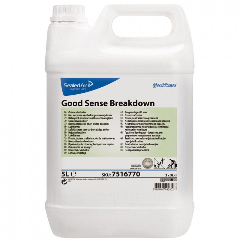 Podwójne działanie bioenzymów oraz opatentowana technologia O.N.T eliminują nieprzyjemne zapachy u źródła. Good Sense Breakdown zawiera kultury bakterii i środki powierzchniowo czynne a jego świeży zapach został opracowany w oparciu o technologie neutralizacji zapachu. Połączenie właściwości czyszczących oraz opatentowanej technologii O.N.T., pozwala na natychmiastowa kontrolę zapachów a działanie kultur bakterii niszczy pozostałości organiczne, które bardzo często są przyczyną nieprzyjemnych zapachów. Usunięcie materii organicznej uniemożliwia ponowne pojawienie się przykrego zapachu. Dzięki stosowaniu Good Sense Breakdown zapobiega się powstawaniu niechcianych zapachów. Preparat Good Sense Breakdown został stworzony specjalnie po to, aby stale kontrolowac zapachy. Skład preparatu pozwala usunąć plamy i niechciane zapachy z wykładzin dywanowych jak również z pisuarów, muszli toaletowych, śmietników, odpływów podłogowych i płytek ceramicznych. Good Sense Breakdown skutecznie eliminuje nieprzyjemny zapach, wydzielając jednocześnie podczas stosowania przyjemny i świeży aromat. Jego zapach utrzymuje się jeszcze na długo po zastosowaniu. Good Sense Breakdown zawiera opatentowaną technologie O.N.T., która neutralizuje niechciane zapachy chemicznie zamiast ich maskowania. Oznacza to, że zapachy są trwale usuwane a pozostawione powierzchnie czyste i świeże.