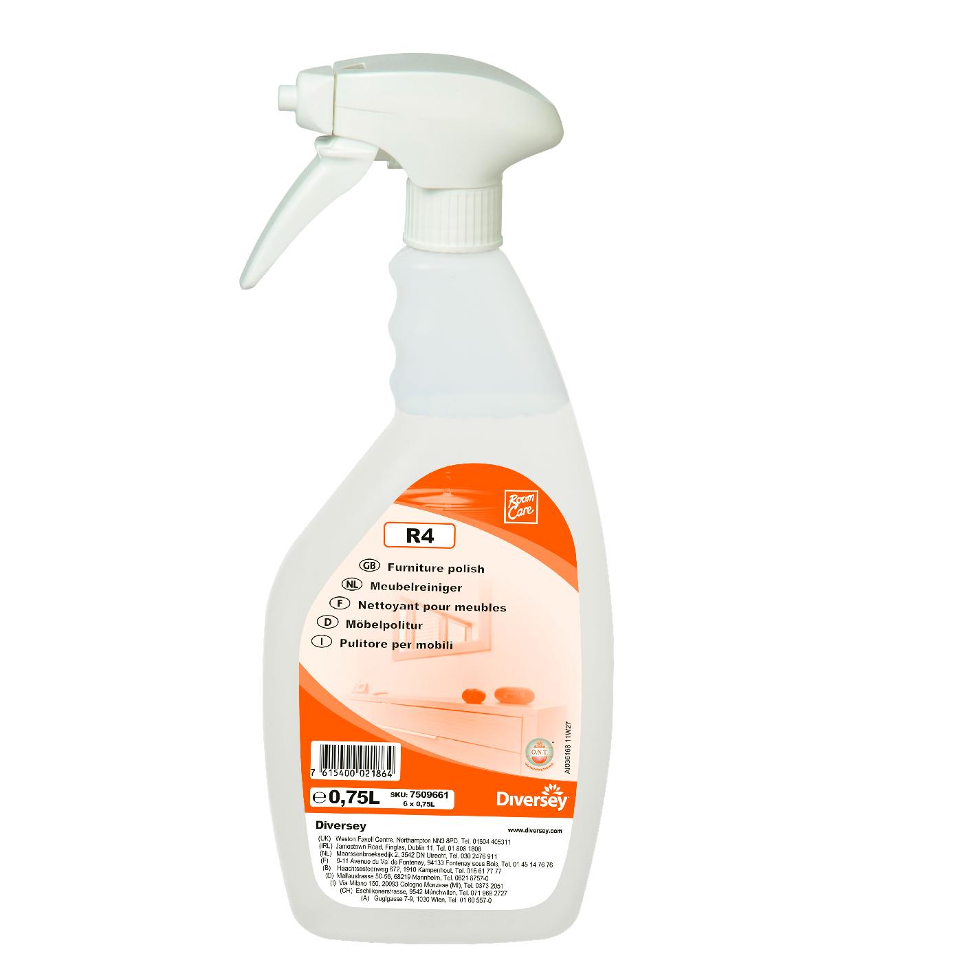 Room Care R4 jest emulsją do pielęgnacji drewna i powierzchni laminowanych (np. meble, drzwi). Jest preparatem, który szybko czyści i zabezpiecza. Polerowany zostawia wysoki połysk. Został opracowany z wysokiej jakości składników do pielęgnacji.
