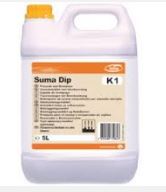 Suma Dip K1 jest specjalnie dobraną kompozycją alkaliów, chloru i związków powierzchniowo czynnych, która w etapie zamaczania wstępnego skutecznie wspomaga usuwanie silnie przywartych zanieczyszczeń z powierzchni naczyń. Zawarty w preparacie aktywny chlor ułatwia usuwanie trudno rozpuszczalnych plam pochodzących z kawy, herbaty i napojów owocowych. Preparat wykazuje skuteczność niezależnie od twardości wody stosowanej do mycia.