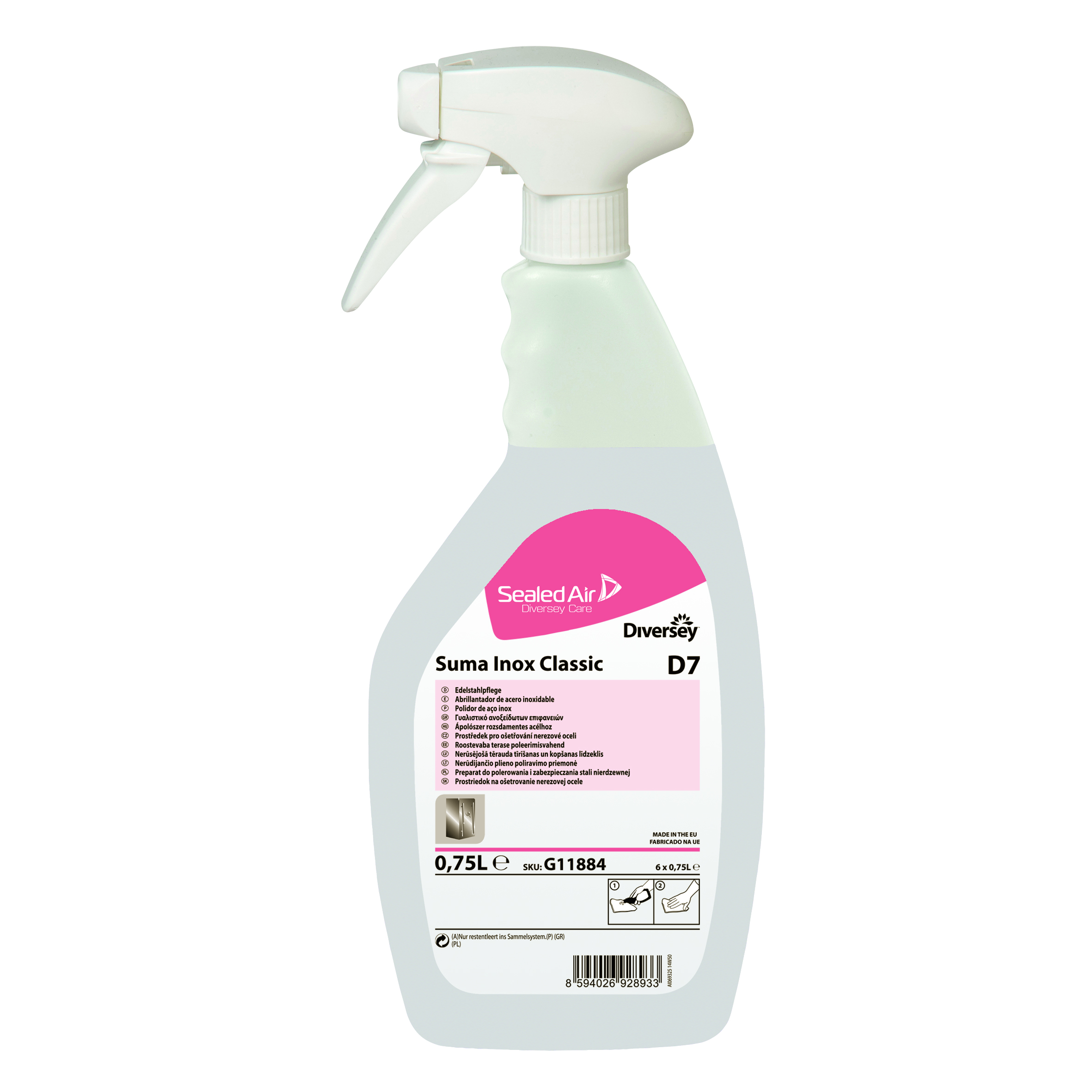 Suma Inox Classic D7 jest preparatem przeznaczonym do polerowania i zabezpieczania powierzchni pionowych wykonanych ze stali nierdzewnej, które nie mają bezpośredniego kontaktu z żywnością np..: chłodziarek, zamrażarek, drzwi i ścianek piekarników, zmywarek, itp.. Suma Inox Classic D7 poleruje i zabezpiecza stalowe powierzchnie pionowe przed planami z wody i tłuszczów, a także przed widocznymi odciskami palców.