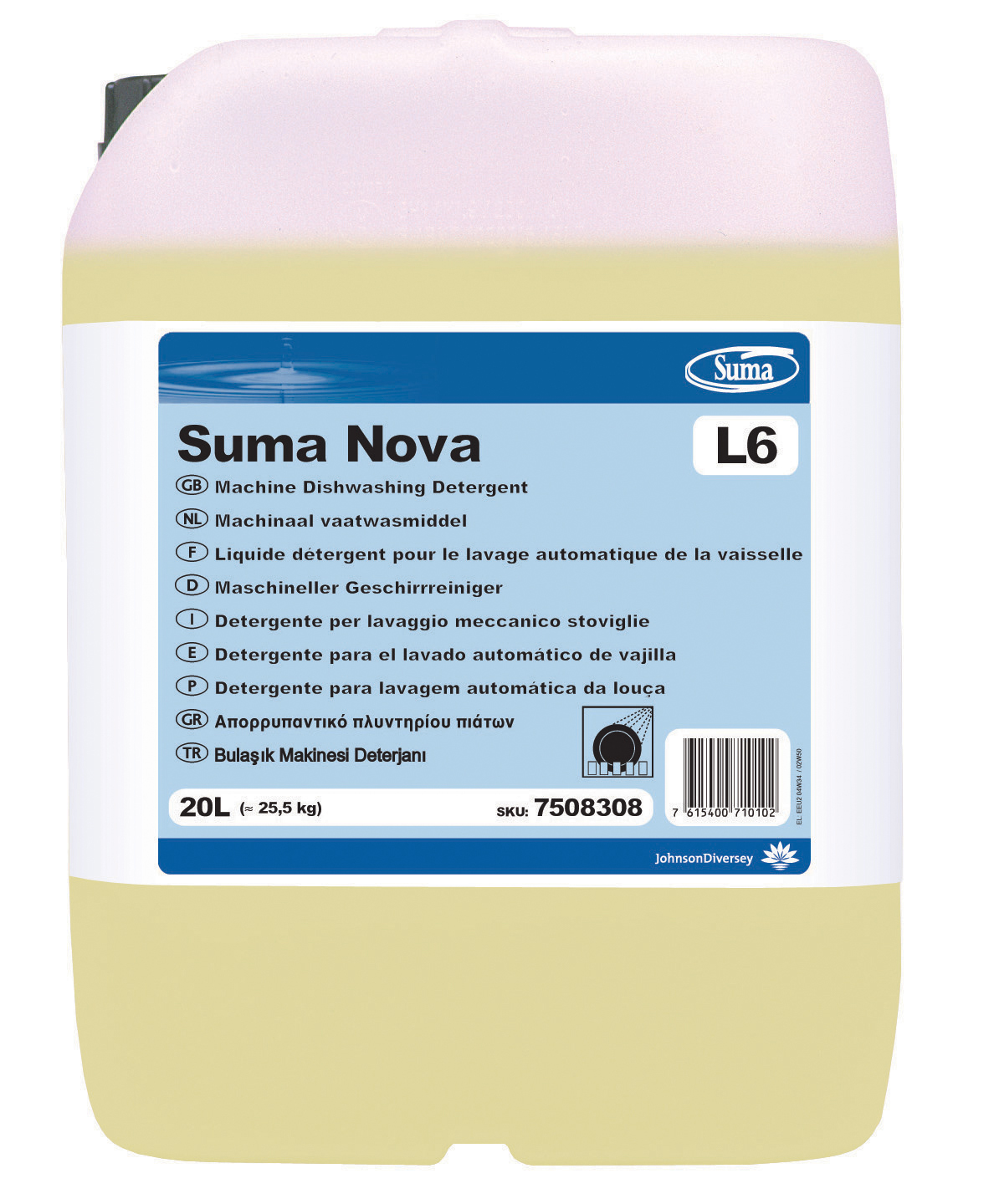 Suma Nova L6 jest płynnym preparatem przeznaczonym do maszynowego mycia naczyń. Skutecznie usuwa wszelkie zanieczyszczenia organiczne oraz osady z kawy i herbaty, także zaschnięte i silnie przywarte do mytych powierzchni. Związki wiążące jony twardości wody wspomagają proces mycia oraz zapobiegają ich osadzaniu się na mytych powierzchniach, dzięki czemu preparat nadaje się do wody o wysokiej twardości jak również w przypadku dużych wahań twardości wody używanej do mycia. Preparat polecany jest do stosowania wszędzie tam, gdzie niepożądany jest zapach chloru.
