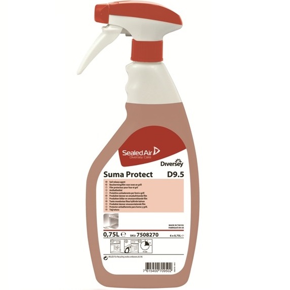 Suma Protect D9.5 jest gotowym do użycia preparatem do tworzenia powłoki ochronnej na podgrzewanych, niemających kontaktu z żywnością powierzchniach w celu ułatwienia ich czyszczenia. Suma Protect D9.5 jest niekorozyjnym preparatem, który może być stosowany na niemające kontaktu z żywnością powierzchnie w piecach i grillach. Preparat zawiera kompozycję środków powierzchniowo czynnych i olejów, które tworzą powłokę zabezpieczajacą podczas wysychania. Zabrudzenia będą przywierać do powłoki i bedą łatwo usuwane z zastosowaniem prepratu czyszczącego lub roztworu płynu do mycia naczyń.