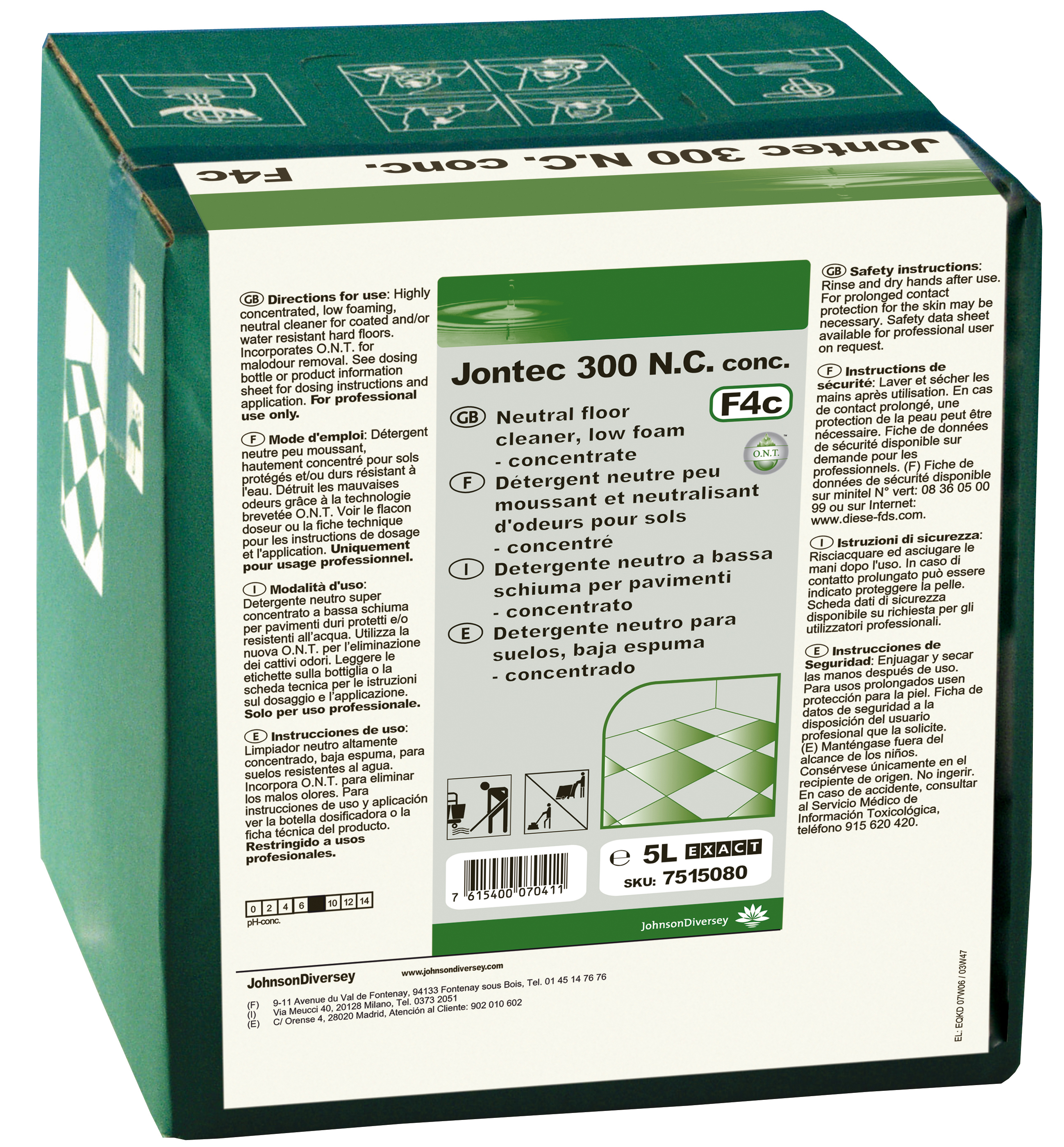 TASKI Jontec 300 NC conc zawiera ponadto technologie O.N.T., która skutecznie i na długi czas eliminuje nieprzyjemne zapachy oraz pozostawia w pomieszczeniu swiezy zapach. Dzieki zastosowaniu nowego barwnika, roztwory robocze maja bardziej intensywna zielona barwe, co pozwala na jeszcze skuteczniejsze wdrazanie systemu kodowania kolorami stosowanych produktów.