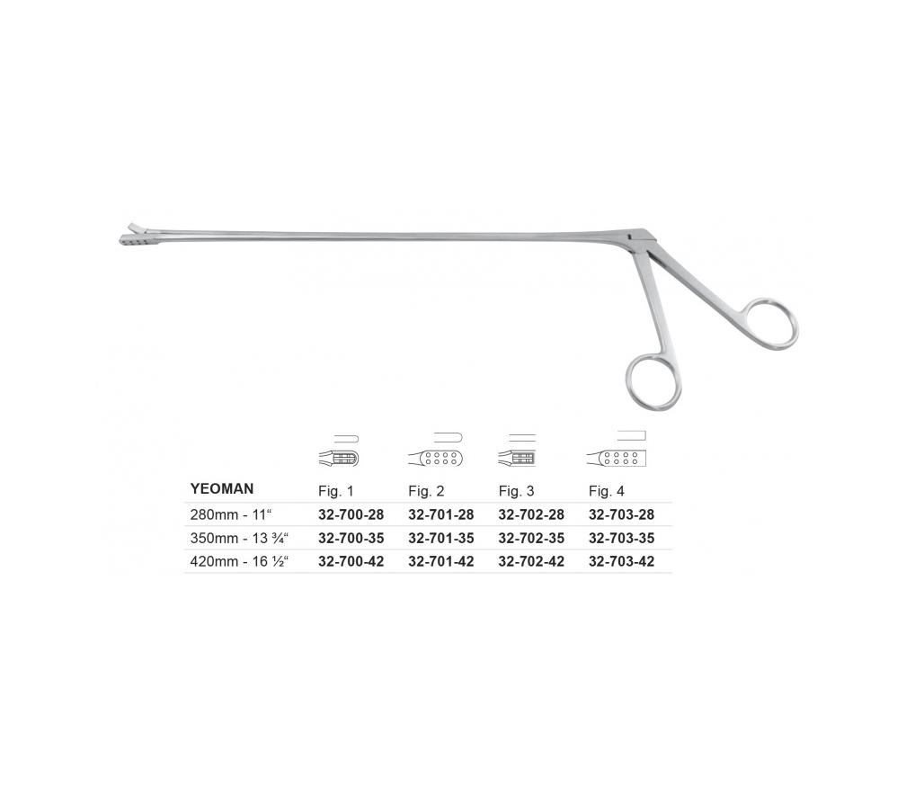 Kleszczyki do biopsji typu YEOMAN z nierozłączalną rękojeścią, dostępne w trzech długościach trzonka i kilku rodzajach kształtu końcówki tnącej (szczegóły na zdjęciu).