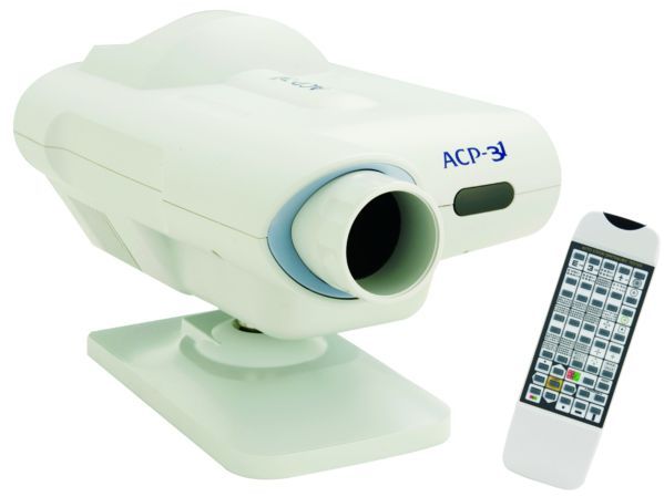 rzutnik testów firmy DONGYANG – KOREA. - rzutnik sterowany pilotem - 31 testów: cyfry, litery, obrazki dla dzieci, Snellen E, Landolt, czerwono-zielony, binokularny, Worth, Schober, steroskopowe, na astygmatyzm - wszystkie maski: linia pozioma, pionowa, pojedynczy znak - bezpośredni dostęp z pilota do każdego optotypu - powiększenie obrazu 30x dla odległości 5 m - w komplecie ekran.