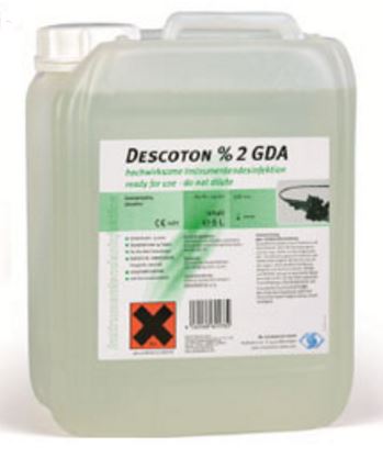Descoton % 2 GDA jest gotowym do użycia, niezawierającym formaldehydów preparatem przeznaczonym do dezynfekcji sprzętu medycznego włącznie ze sztywnymi i giętkimi endoskopami. Zawiera inhibitory korozji.