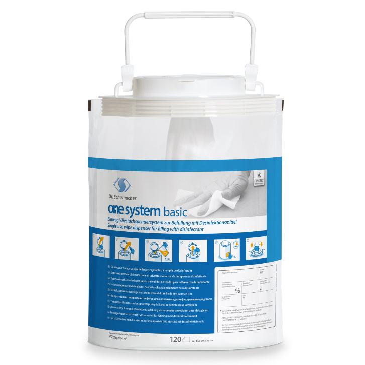 One System Basic jest jednorazowym systemem dozującym chusteczki włóknikowe stosowane do dezynfekcji czyszczenia powierzchni we wszelkich obszarach medycznych, w tym powierzchnie wyrobów medycznych. Wyjątkowo wygodny i kompaktowy dozownik One System Basic w innowacyjnym stojącym opakowaniu jest prosty, bezpieczny i skuteczny. Stanowi idealne rozwiązanie w obszarach o możliwym ryzyku wystąpienia infekcji jak również w obszarach ze szczególnym ryzykiem wystąpienia infekcji.