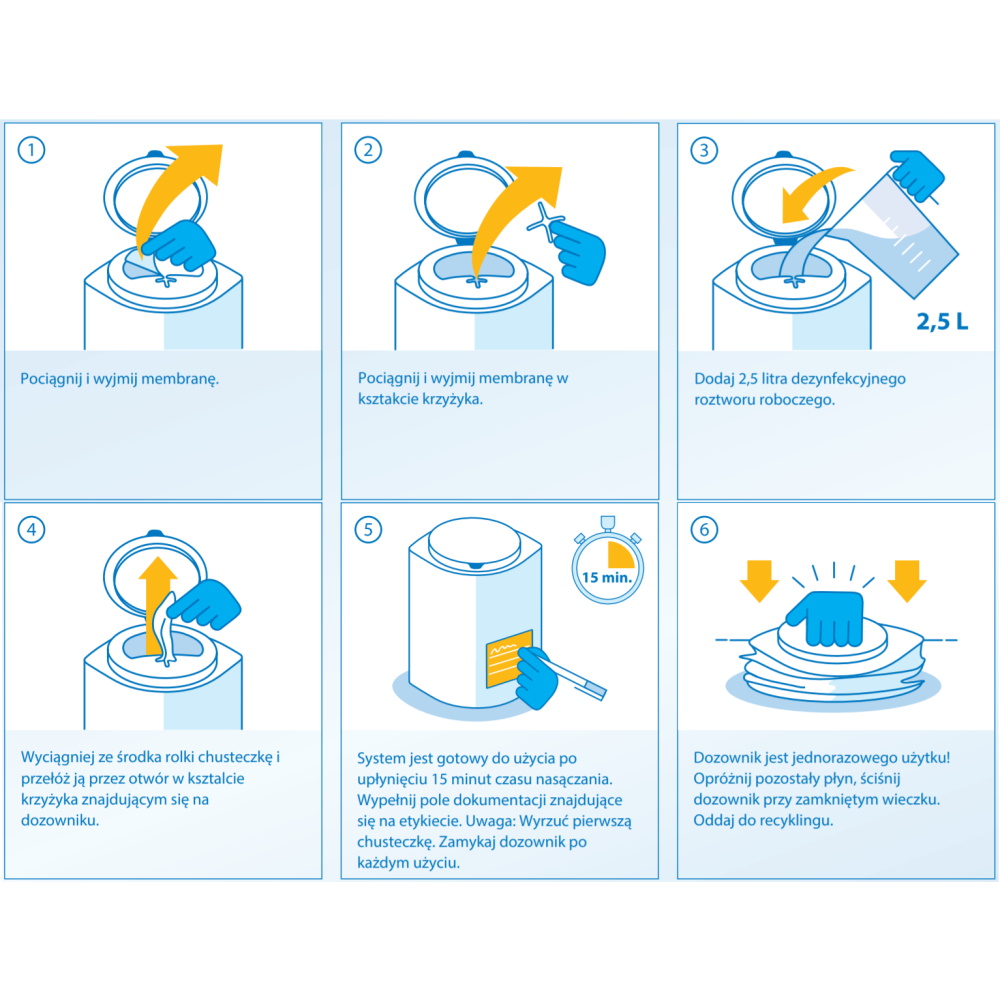 Skład: One System Basic to innowacyjny jednorazowy system dozujący wraz z suchymi chustami przeznaczony do napełniania środkami do dezynfekcji powierzchni szczególnie polecany do stosowania w obszarach o szczególnym ryzyku zagrożenia.