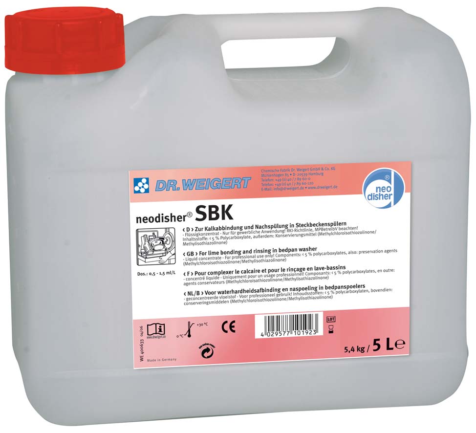 Środek płuczący i zmiękczający wodę, płyn. Zawiera kwasy organiczne. Zapobiega przed osadami kamienia wodnego w generatorach pary, układach rurowych i dyszach rozpryskowych. Ułatwia szybkie i bez zaciekowe suszenie. Zbija pianę. neodisher SBK nadaje się do kwasoodpornych myjni utensyliów szpitalnych. 5l.