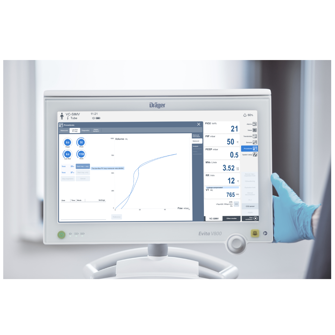 - Ułatwione procedury rekrutacji (np. QuickSet® i PressureLink) oraz wsparcie w podejmowaniu decyzji dotyczących leczenia w postaci trendów oddechowych (PEEP, EIP, Vt, Cdyn)