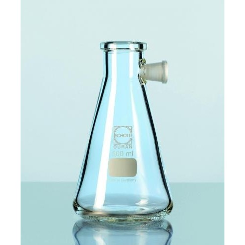 Zgodne z normami DIN 12476 i ISO 6556. Kształt Erlenmeyera. Grubościenne, do użytku próżniowego. Ze szlifem żeńskim 17,5/26 do podłączenia węża próżniowego o śred. zewn. 15 do 18 mm. Kolby próżniowe całkowicie spełniają wymagania Niemieckiej Ustawy Bezpieczeństwa Sprzętu Laboratoryjnego.