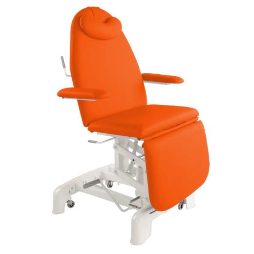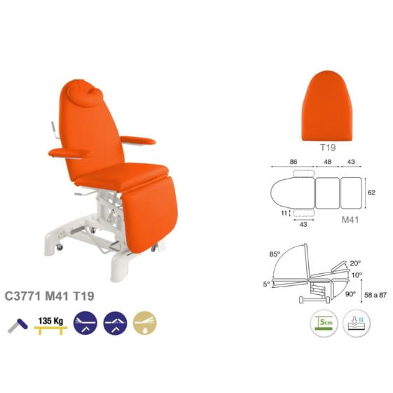 C3771 to model fotela zabiegowego z hydrauliczną regulacją wysokości w zakresie od od 58 do 87 cm. Regulacja hydrauliczna odbywa się za pomocą manualnej dźwigni nożnej. Ten typ regulacji nie wymaga podłączenia do sieci i uniezależnia fotel od przewodów. Wygodny system jezdny pozwala na łatwy transport. Podstawa fotela została zabudowana wytrzymałym tworzywem sztucznym zakrywającym elementy konstrukcyjne i ułatwiającym mycie i dezynfekcję.