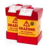Zastosowanie: służy do zbierania igieł, ostrzy od lancetów, żyletek oraz drobnych, ostrych narzędzi medycznych. Budowa: pojemnik wykonany jest z kartonu o podwyższonej sztywności (500 gr/m2). Posiada podwójne ścianki oraz wkład polietylenowy – zabezpieczający przed przekłuciem i przemakaniem.